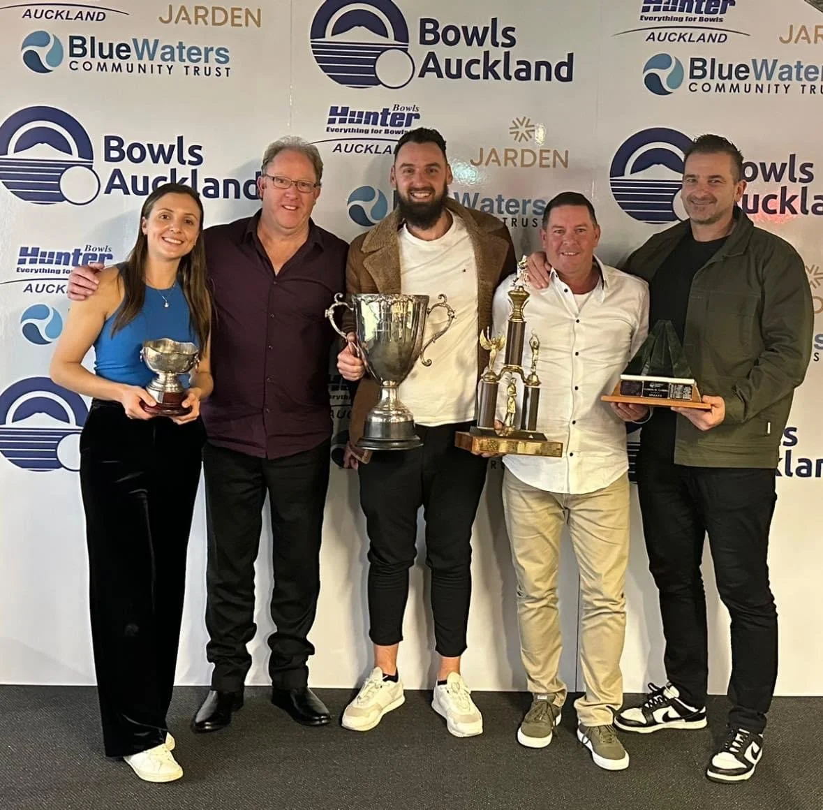 Bowls Auckland Prize Giving 2023 - MABC Recipients; Jhanna Savov, Randall Watkins, Zoran Bartulovich, Tony Grantham & Neven Grgicevich.